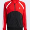 An all over color block design in red and black with a full front branded zip fastening in black and a bomber style collar in red. Ribbed cuffs on the long raglan style sleeves with a stretch ribbed waistband and two zip fastening pockets situated on the waist. 70% Cotton and 30% Recycled Polyester.