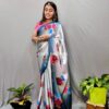 Spread the aura of freshness with this Satin Silk saree. This saree is made of Japan Satin Silk fabric which is highlighted with beautiful Digitally printed work which makes this saree more elegant. This Satin silk saree is versatile, light-weight, extremely soft. This Satin Saree manufactured using the ‘Satin’ weave, giving it a smooth, shiny, lustrous surface. This saree is paired with unstitched matching Bangalori Silk fabric blouse piece which can be stitched as per your requirement. This saree is comfortable to wear and care. You can wear this saree for regular social meets and other homely events. Pair it with stylish accessories to complete the look.
