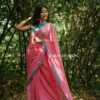 This Linen saree with Plain print is a must have. Saree Fabric is linen and Blouse is Cotton with Border on edges and with Tussles. Saree length is 5.5 Meter and Blouse is unstitched and is 1 Meter. Separate hand wash is recommended.