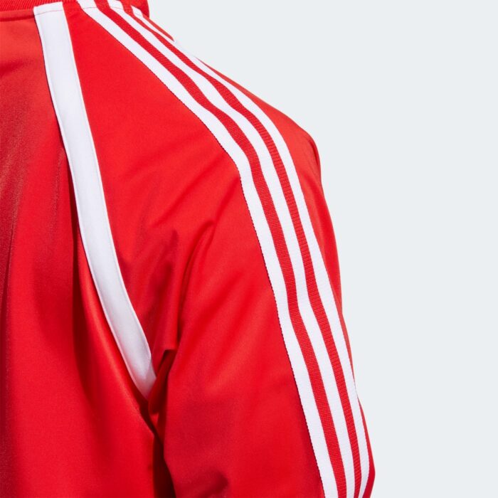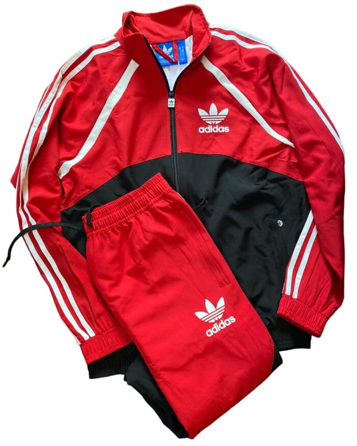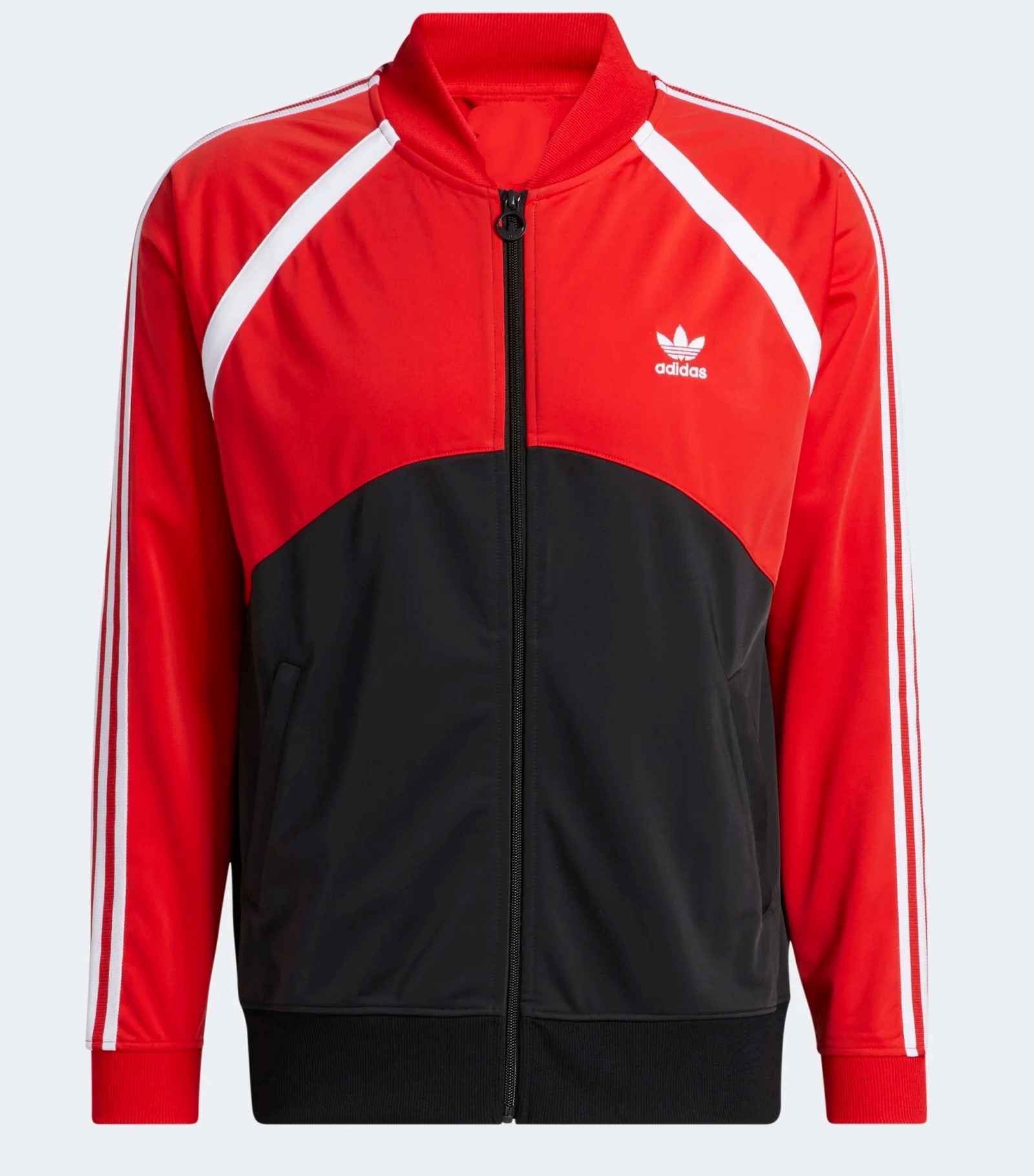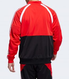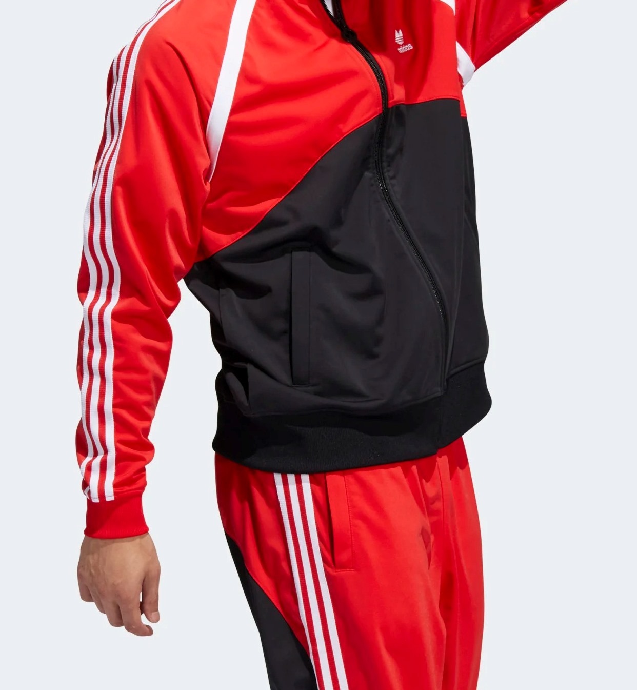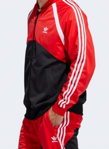 An all over color block design in red and black with a full front branded zip fastening in black and a bomber style collar in red. Ribbed cuffs on the long raglan style sleeves with a stretch ribbed waistband and two zip fastening pockets situated on the waist. 70% Cotton and 30% Recycled Polyester.
