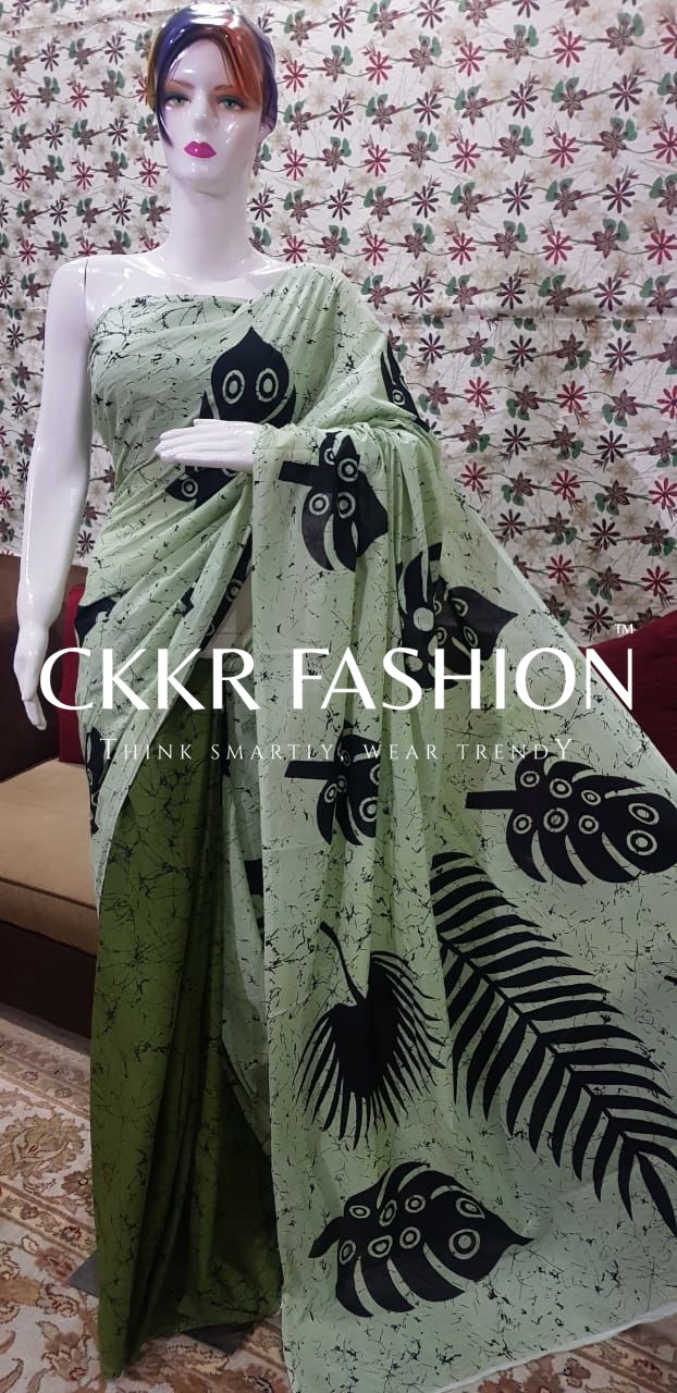 Batik Cotton Saree is designed for modern women who constantly seek for new ways to update their style and love to follow contemporary fashion trends. Make your day more beautiful with this Batik Cotton Saree. It comes in a beautiful color and features a beautiful pattern, which gives it a very modern look. Made of superior quality Mul Mul Cotton, this saree is so smooth and comfortable to wear. Its lightweight fabric makes it perfect for any occasion.