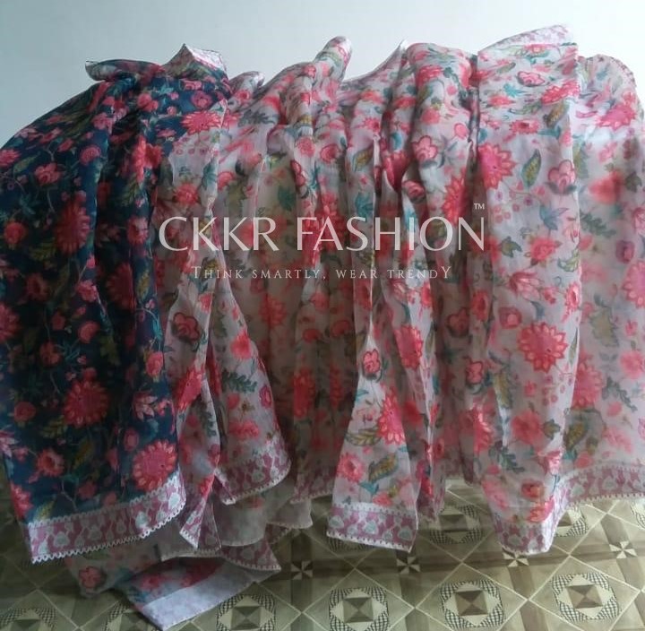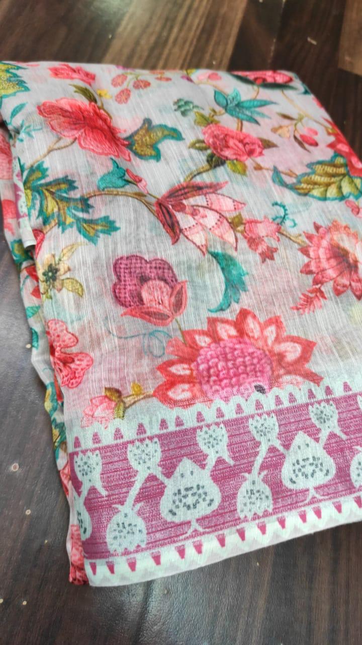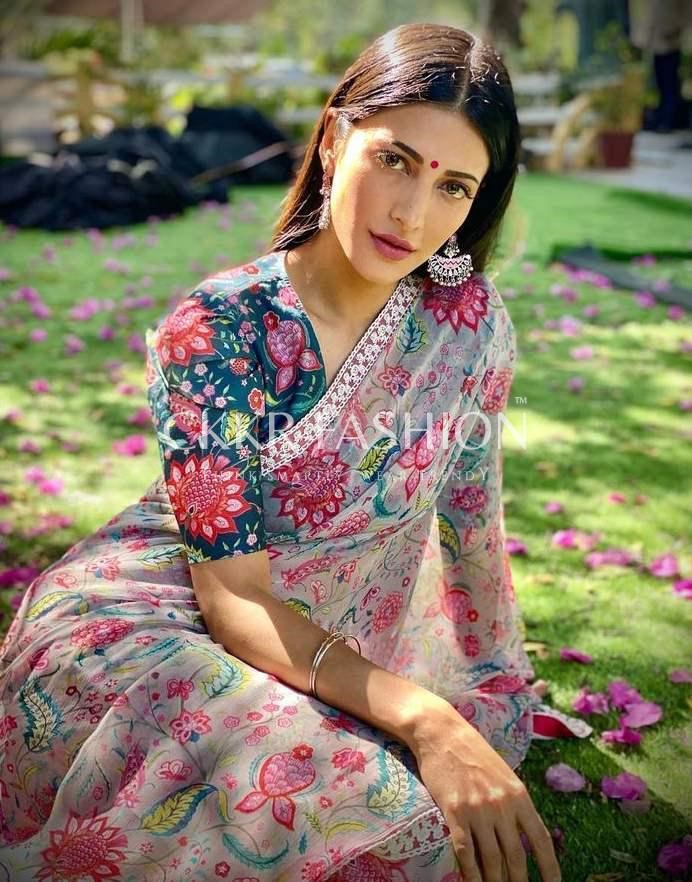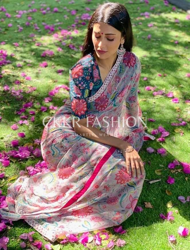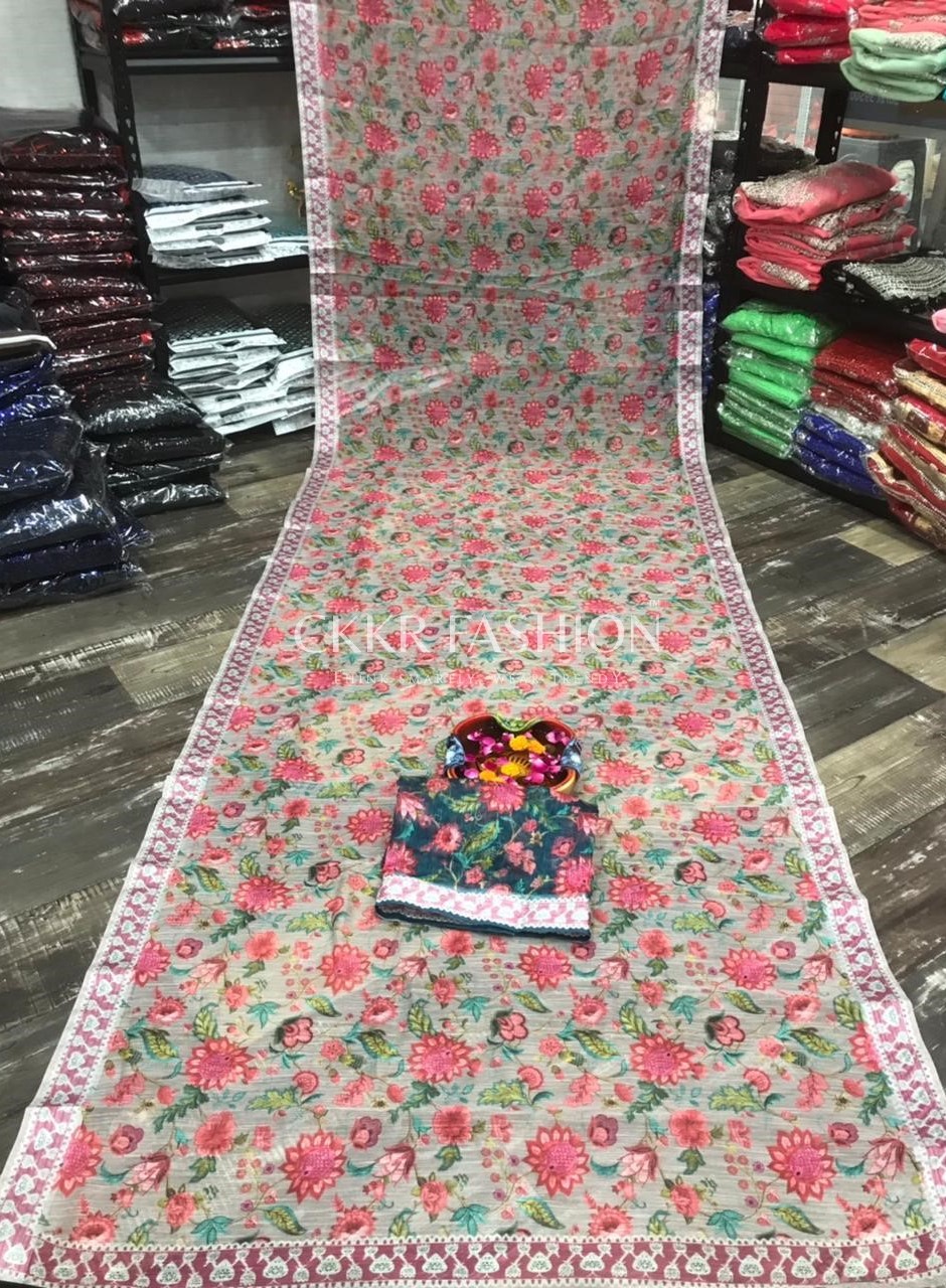 Look absolutely radiant in this latest saree. We’re convinced that heavenly gardens look just as beautiful as you in this floral saree. The delicate floral prints stand out on the lightweight fabric that drapes effortlessly. The look features a contrasting turquoise blouse with matching floral patterns made on it. Saree Length is 5.5 Mtrs and Blouse is 0.80 Mtrs.