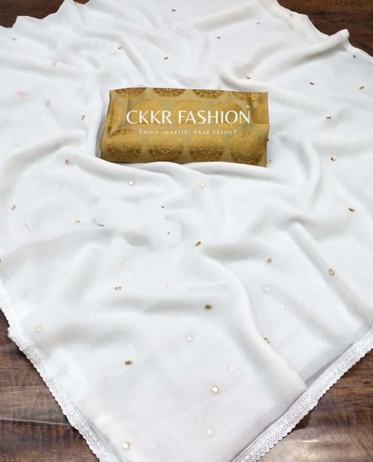 Beautifully designed and exclusive ethnic wear sarees made of high-quality Georgette fabric with lace border work. We bring you a nice addition to the wardrobe of every fashionable female, who wants to look glamorous and distinct. This sari comes with matching Georgette fabric, and lace border, and be stitched according to your comfort. This saree is ideal for various occasion, festivals and social/friends/family get-togethers, ceremonies or rituals, business functions wherever you want to flaunt your style. Also saree design and color combination are suitable for girls or women of across all age or region. Wear it with matching accessories to get complemented on next ethnic wear look.