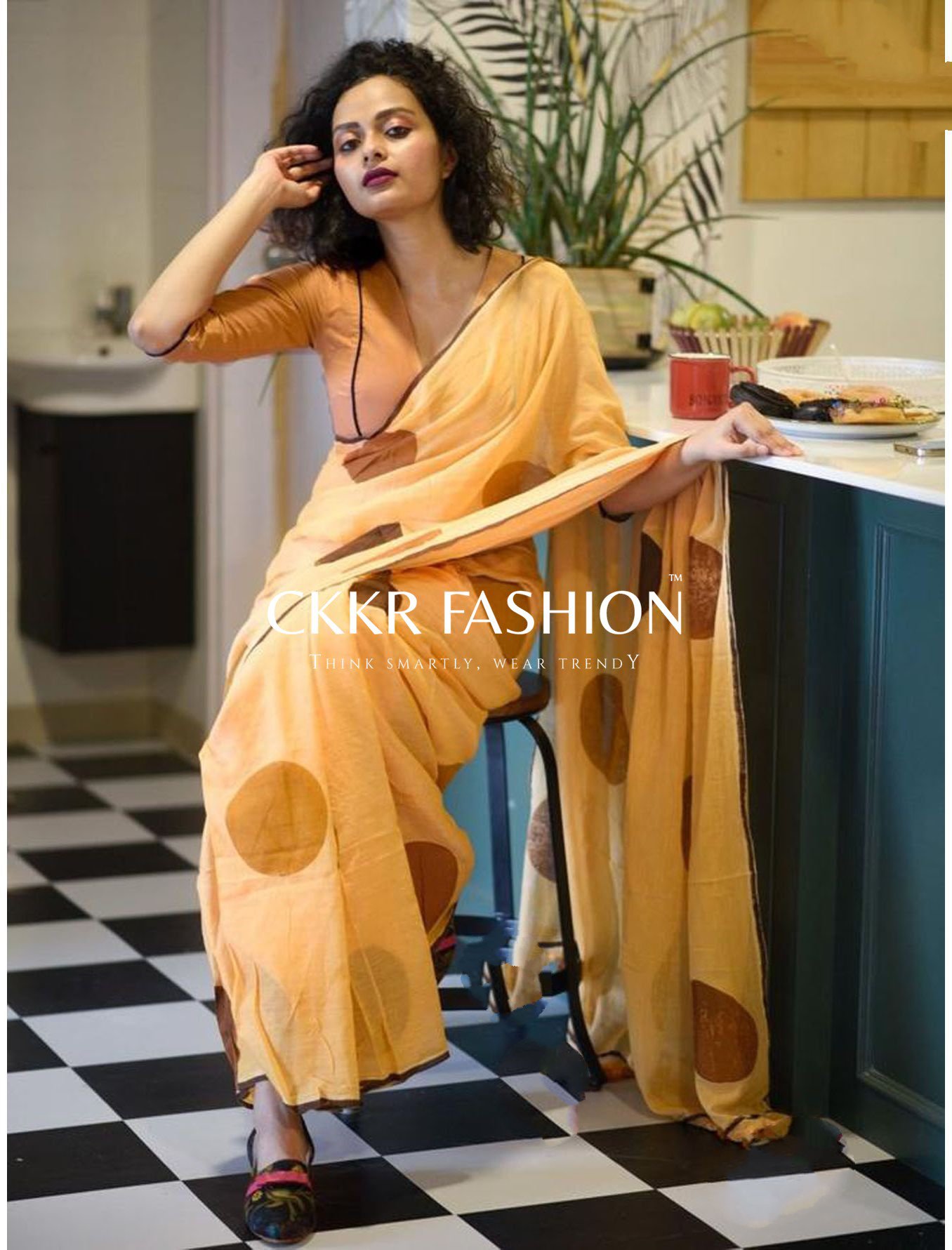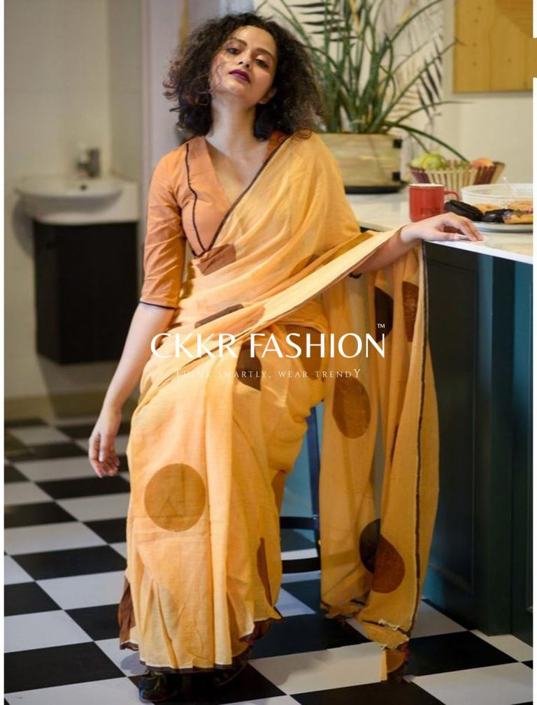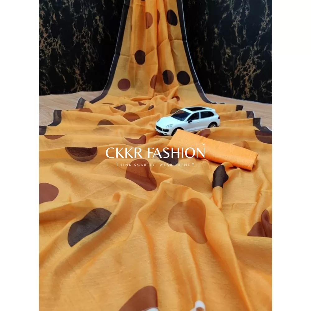 This Pink and Yellow blue made – in heaven Linen Cotton saree with screen-printed polka dots is all heart.