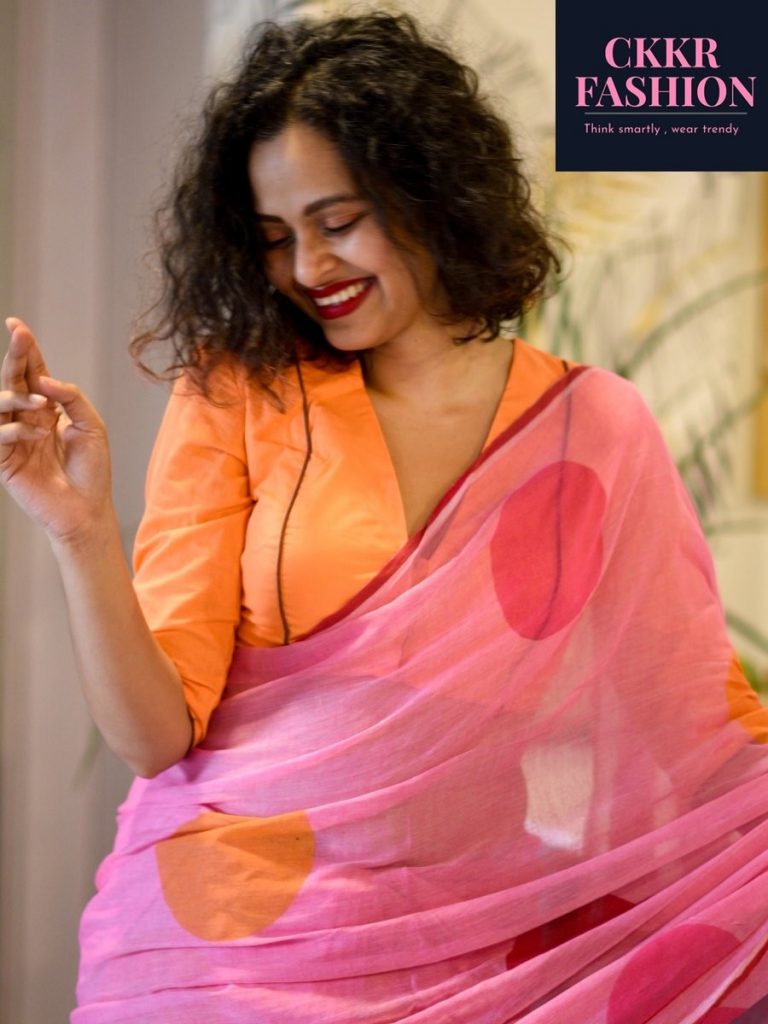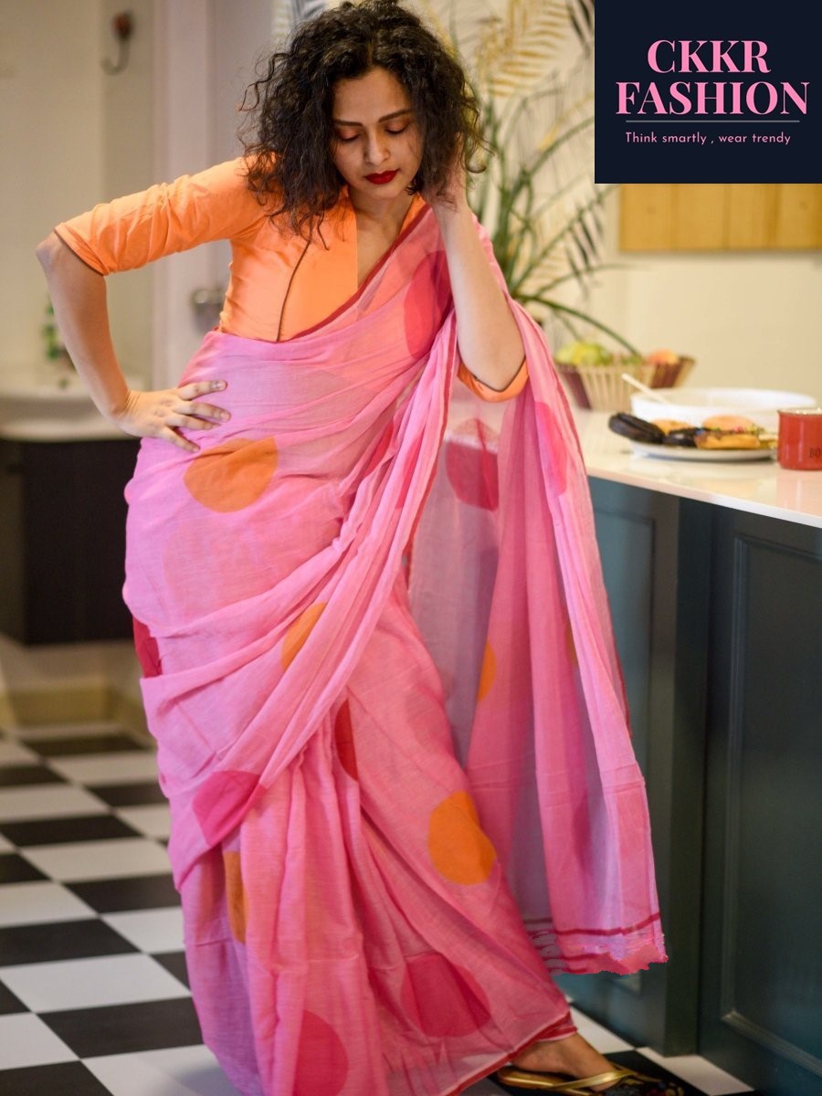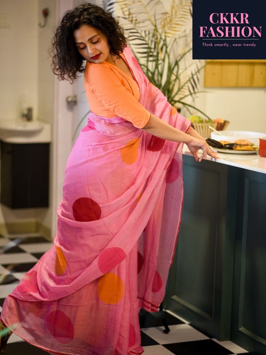 This Pink and Yellow blue made – in heaven Linen Cotton saree with screen-printed polka dots is all heart.