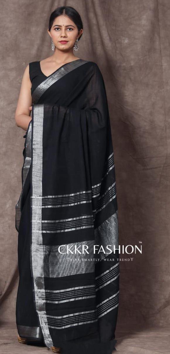 This Linen saree with Plain print is a must have. Saree Fabric is linen and Blouse is Linen with Border on edges and with Tussles. Saree length is 5.5 Meters and Blouse is unstitched and is 1 Meter. Separate hand wash is recommended.