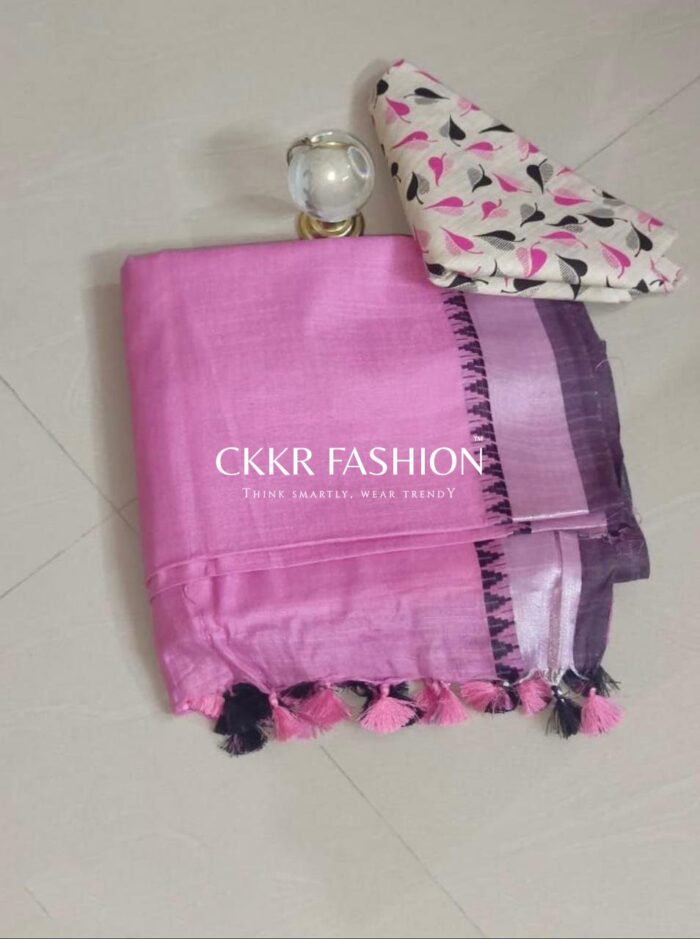 This Linen saree with Plain print is a must have. Saree Fabric is linen and Blouse is Linen with Border on edges and with Tussles. Saree length is 5.5 Meters and Blouse is unstitched and is 1 Meter. Separate hand wash is recommended.