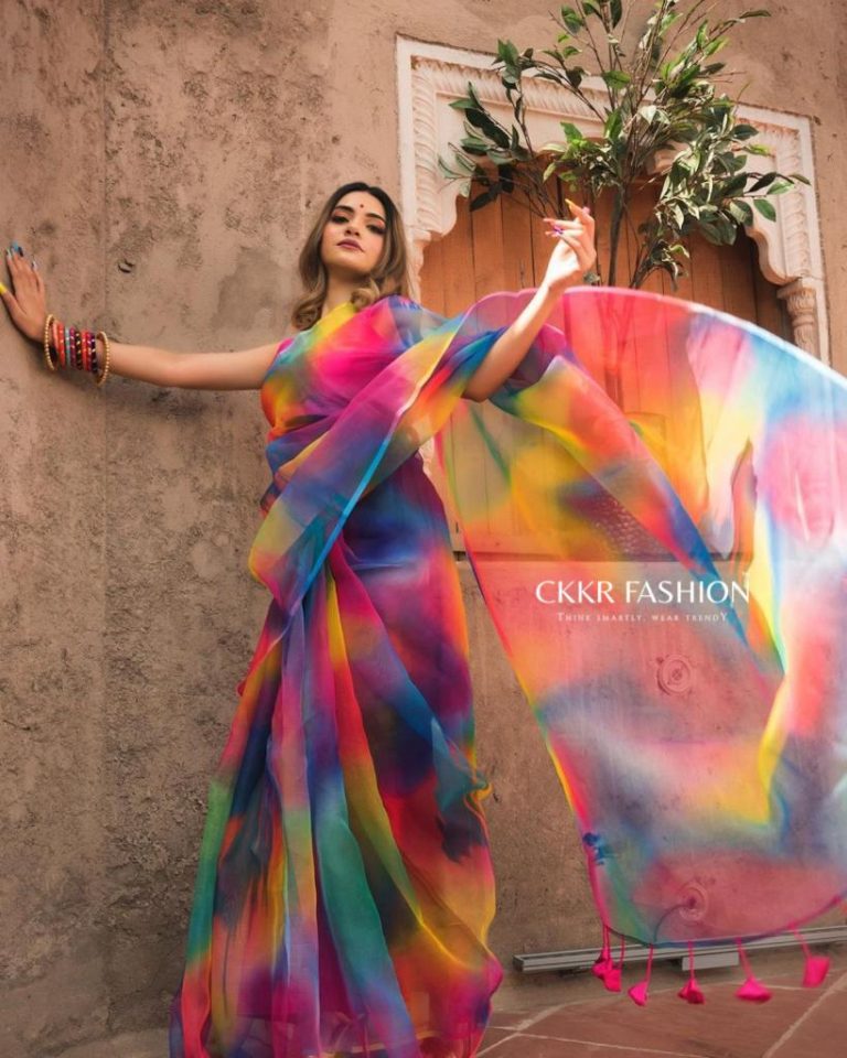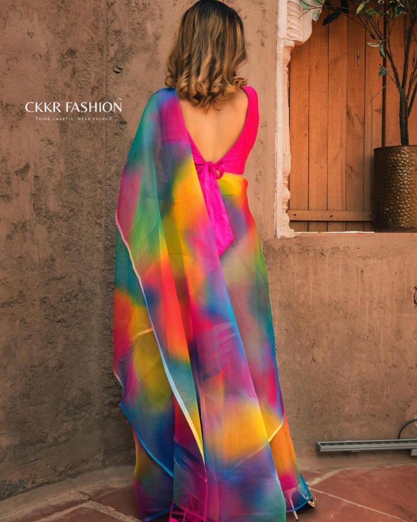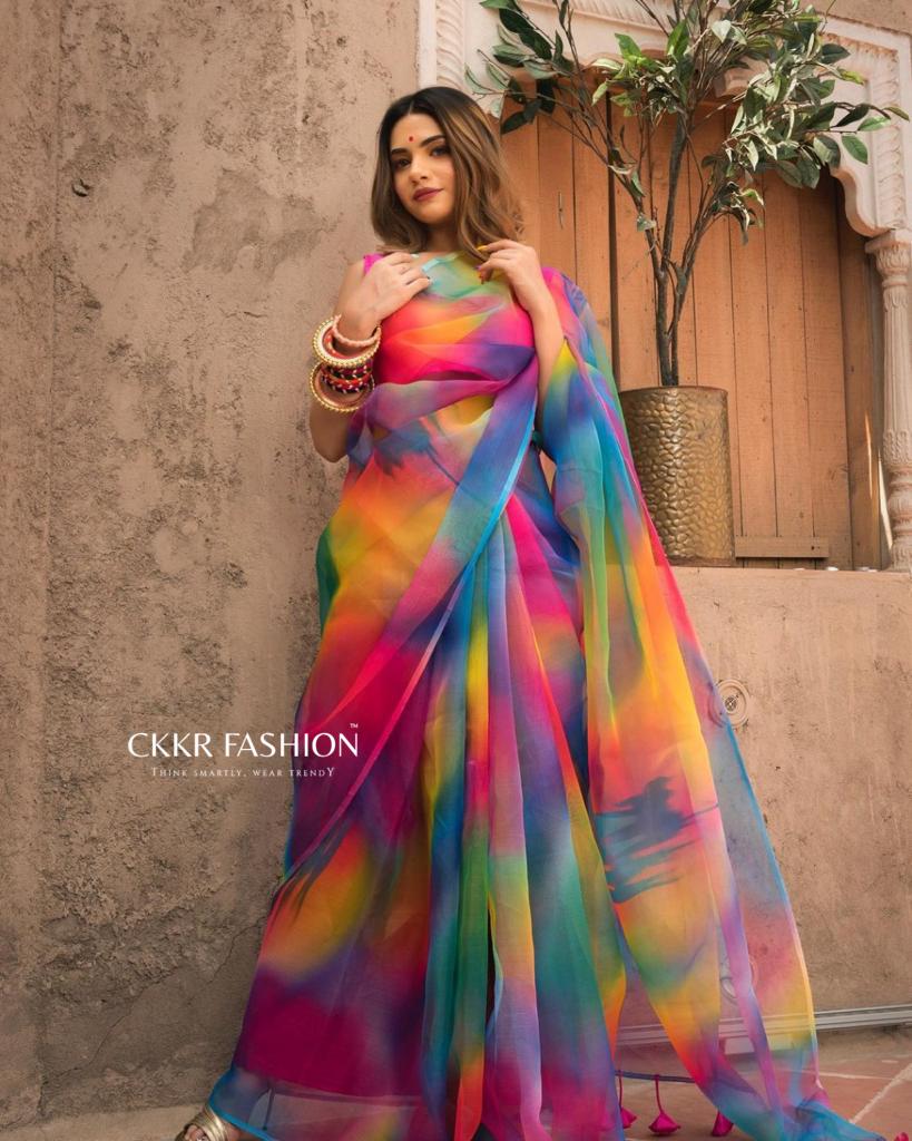 Trending Light Weight Yellow Color Organza Multicolor Printed Saree. The Material is light weight and is digitally printed. Saree Length is 5.5 meters and blouse is 1 meter and comes with Tussles. Perfect for summer wear.