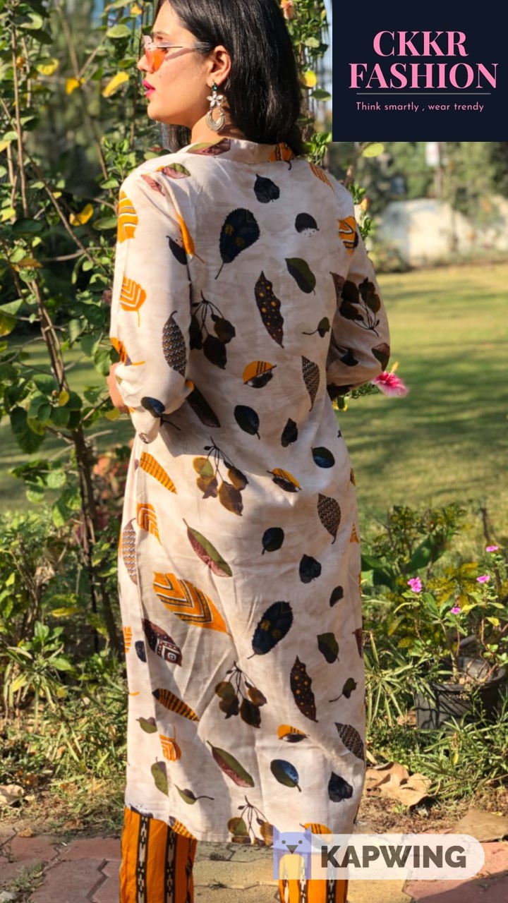 Designer Kurti With Palazzo Style in Palazzo special, designer Kurti With Pallazo, Kurti (Top) Fabric 14 Kg Rayon Foil Print and Pallazo 14 Kg Rayon Foil Print, Kurti Length: 46 Inches, Pallazo: 40 inches, Size: L 40 Inches . Hand washable.