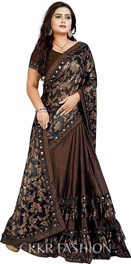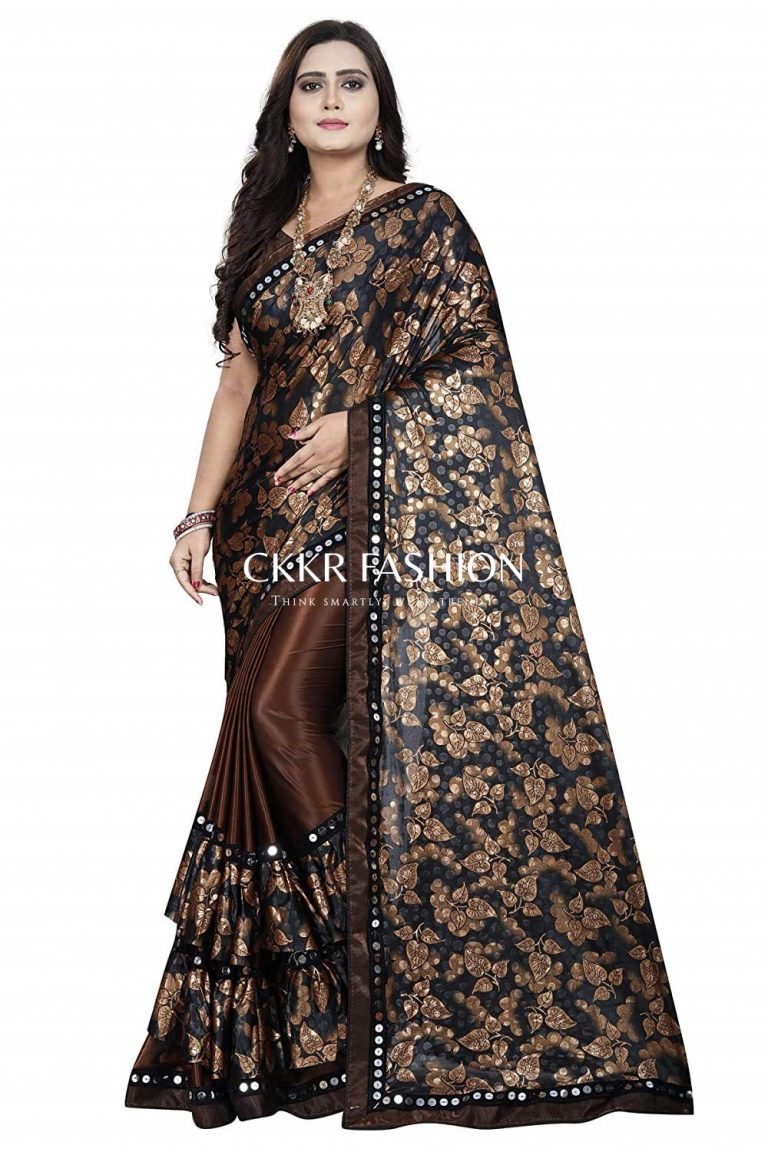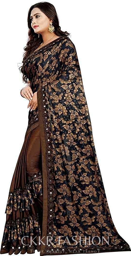 Ruffle Sarees made with High-quality Lycra fabric. Eye-catching patterns which suites for events and parties. Ideal for females who have sun-kissed skin.