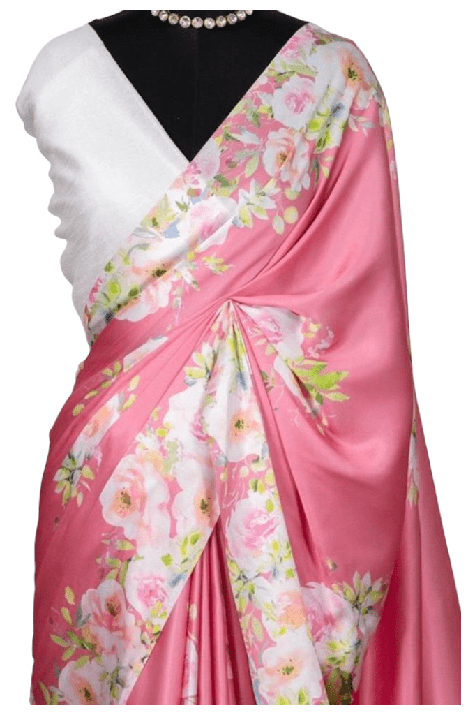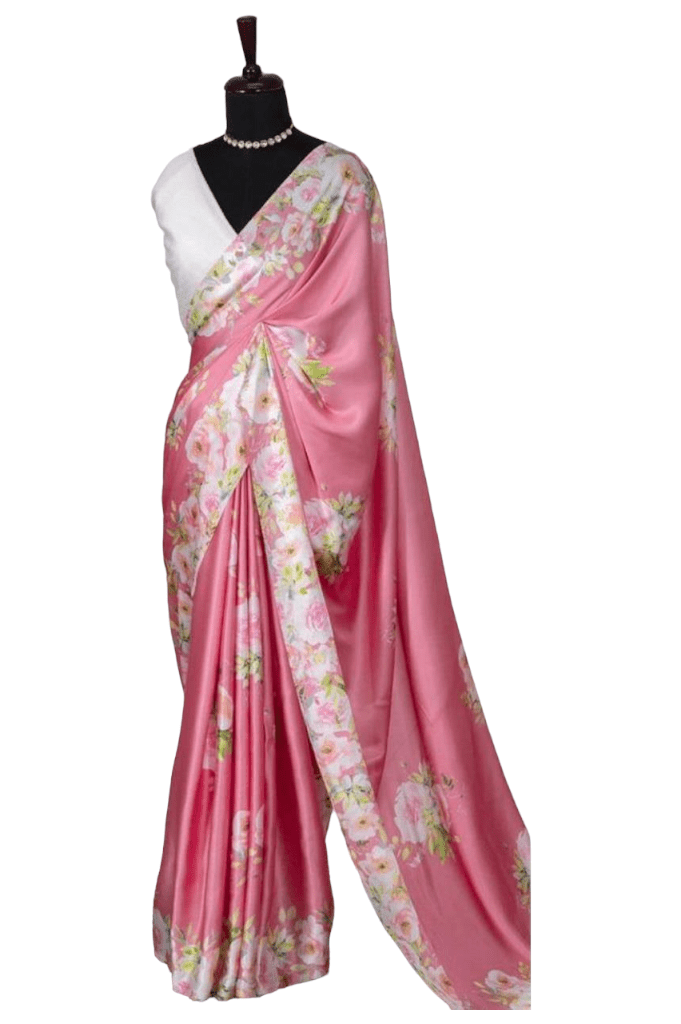The Saree has a smooth, shiny, and glossy surface. The satin silk fabric makes for an elegant drape and is very glossy.